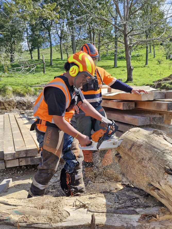 Patrick from Silvipath teaching chainsaw skills to a Te Puke High School student.