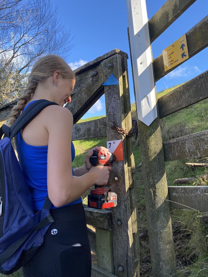 Pāpāmoa College student, Jess Hambrook, installing the new beginners orienteering course. Jess designed the course for the community to enjoy with the help of Orienteering BOP.