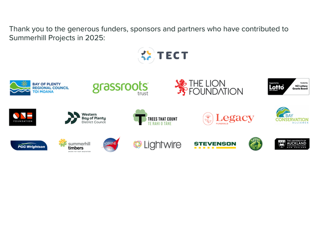 Thank you to our volunteers, partners, funders, supporters, and everyone who walked a track, planted a tree, attended an event, or contributed in any way. Your enthusiasm, hard work, and belief in Summerhill’s mission continue to make a real difference.